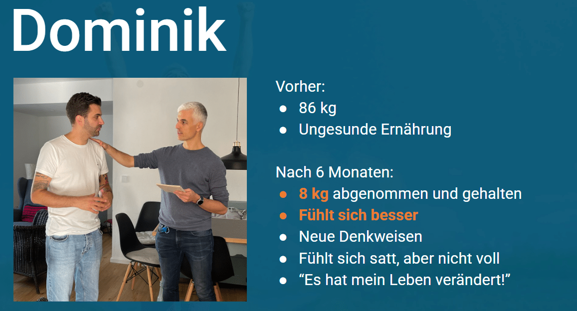 Er ist auch der ideale Ansprechpartner, wenn man mit der Umsetzung oder der eigenen Disziplin kämpft oder Schwierigkeiten im Umfeld z. B. mit der Familie hat. Seine Beratung ist fachlich und menschlich zu 100% zu empfehlen.