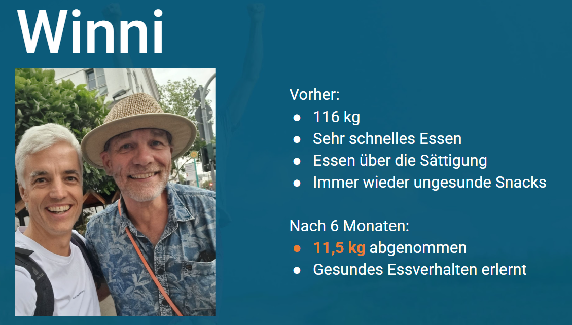 Er ist auch der ideale Ansprechpartner, wenn man mit der Umsetzung oder der eigenen Disziplin kämpft oder Schwierigkeiten im Umfeld z. B. mit der Familie hat. Seine Beratung ist fachlich und menschlich zu 100% zu empfehlen.